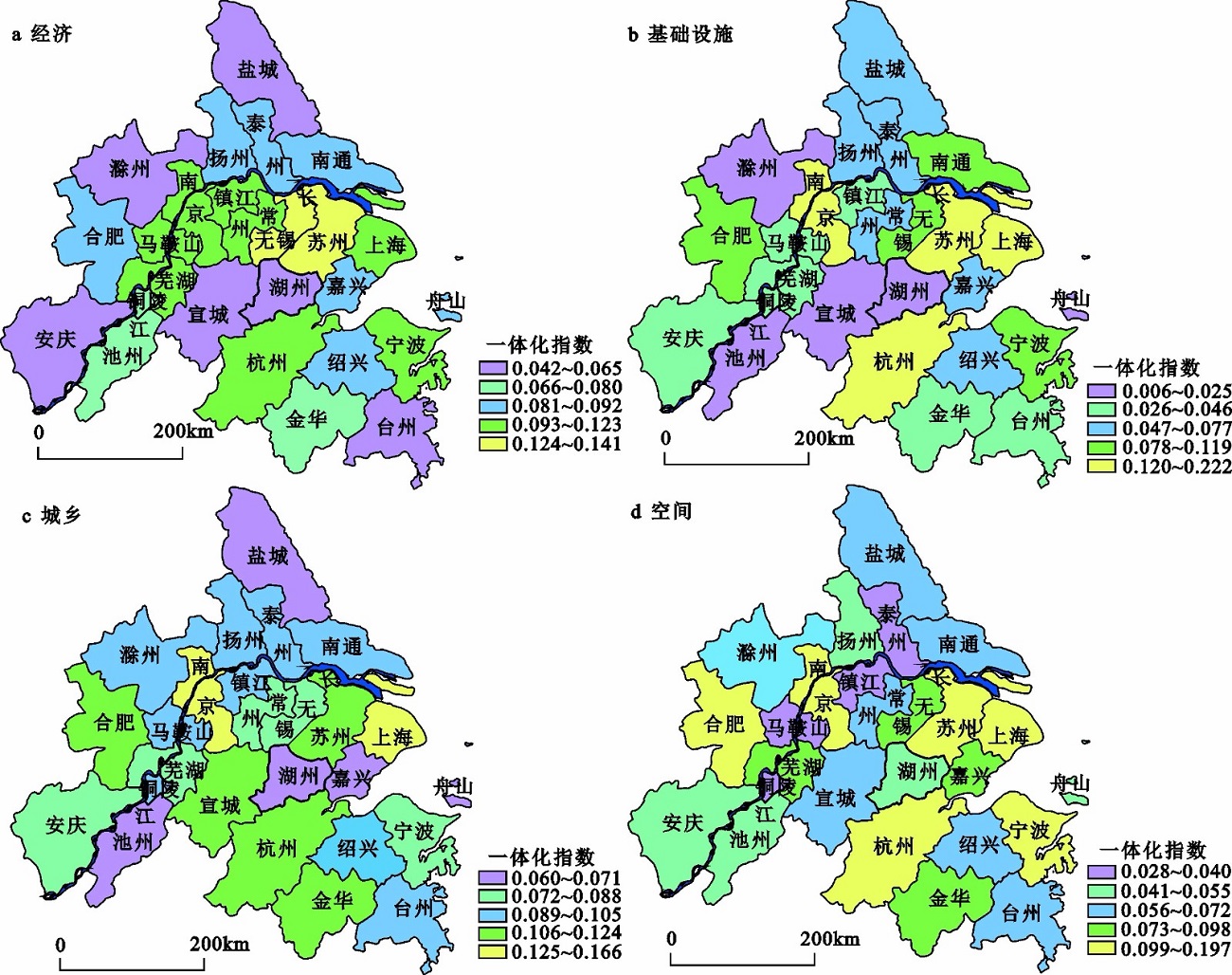 | Fig. 2 Spatial distribution of integration process of each dimension in the Yangtze River Delta urban agglomeration in 2011-2018 |