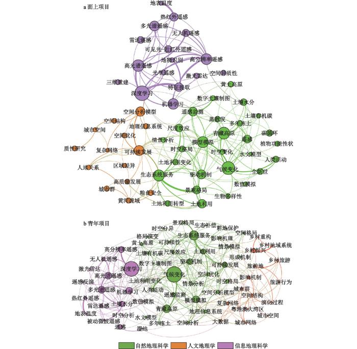自然地理学与信息地理学关键词有一定交叉,交叉程度大于人文地理学与信息地理的交叉,体现了自然地理学者较好的地理信息技术能力,此外,其交叉内容与水平在各类项目之间有差异。青年基金交叉程度最高,热点交叉关键词是“多源遥感”“数值模拟”“水文分析”“气候变化”“土壤有机碳”“黄土高原”“多年冻土”等,表明青年学者由于其教育背景与所处发展阶段,更善于运用地理信息技术。面上项目中,热点交叉关键词是“尺度效应”“不确定性”“植被恢复”“数字土壤制图”等,更多体现技术导向的理论探索。