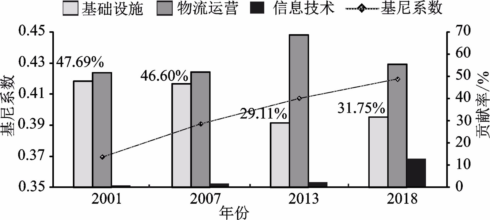 | Fig. 3 Gini coefficient and contribution rate of each dimension of dry port logistics hub development in China |