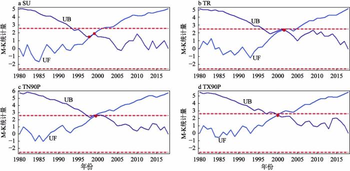 SU为夏天日数;TR为热夜日数;TN90P为暖夜日数;TX90P为暖昼日数;虚线为α=0.01水平下的临界线