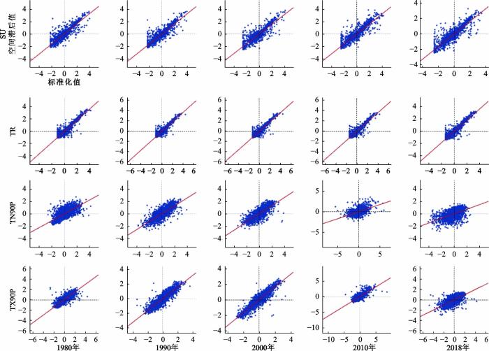 空间自相关是指观测变量在空间上的依赖性,即空间位置相近的变量是否具有相似或相反的变化趋势,最常用的统计量为Moran’s I指数[23]。本研究通过绘制不同时期的Moran散点图并计算Moran’sI指数来描述中国极端高温空间形态的演变。
