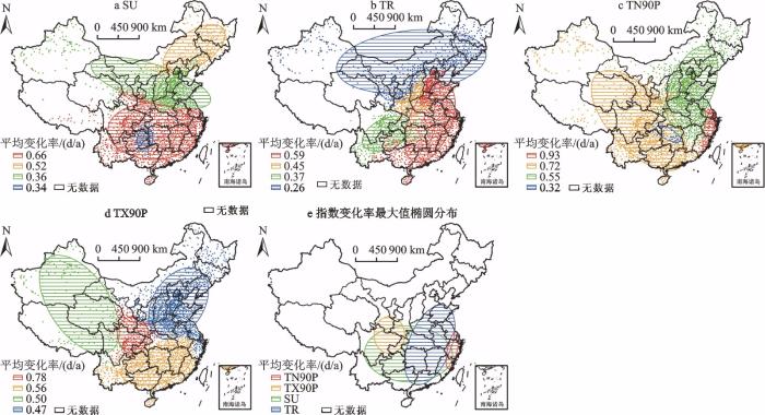 结合标准差椭圆分析得出(图9e),夏天日数变化趋势最大的站点呈东西分布格局,热夜日数、暖夜日数和暖昼日数变化趋势最大的站点呈南北分布格局。4个指数变化趋势最显著的地区均位于南方,其中浙江、福建两省的夏天日数、热夜日数和暖夜日数的变化率均高于全国其他地区;甘肃、四川、陕西三省和重庆市交界地带,夏天日数和暖昼日数变化趋势均显著高于全国其他地区。