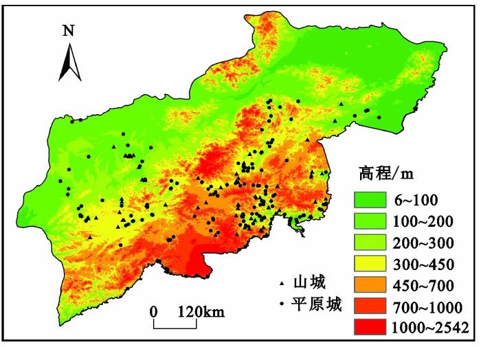 ... 本文的234座唐朝渤海国古城遗址是由研究区各县志等历史文献及考古发掘报告组成[9 ~11 ] ,包括145座平原城和89座山城.根据各个古城址的位置记载,利用百度地图获取经纬度,运用地理空间数据云获取东北地区90 m分辨率的SRTM DEM数据、行政区划图及水系图,在ArcGIS 10.2软件中进行配准和矢量化处理,以此揭示唐朝渤海国人类生活与自然和人文因素之间的相互作用.  ...