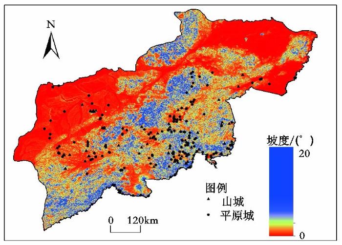 ... 地面坡度对居民用地选择的影响是多方面的.通过东北地区DEM数据生成坡度图(图4 ),然后利用ArcGIS提取不同坡度范围内的古城址数目,分析古城分布与坡度的关系.根据毕硕本等[28 ] 对坡度的分类方法,可以将坡度分为6个等级:非常适宜人类居住(0~3°)、较为适宜人类居住的坡度(3°~6°)、适宜人类居住的坡度(6°~9°)、不太适宜人类居住的坡度(9°~12°)、不适宜人类居住的坡度(12°~15°)和非常不适宜人类居住的坡度(15°以上).  ...