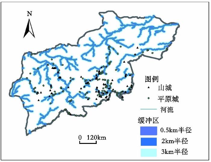 ... 在中国古代,水源是城市选址的重要参考因素.《管子·乘马》中,就曾提到“高毋近旱而水用足,低毋近水而沟防省”,这说明水源对于城市的生活和军事都有重要影响[29 ] .东北地区河流较多,共有七大河流,分属松花江和辽河流域两大水系,季节性较强,降水是主要的水资源补给.由于降水量分布不均匀,水资源也呈现出东多西少的情况.将东北地区的水系图导入ArcGIS软件,分别对河流做出了各级缓冲区,再将唐朝渤海古城址的位置与之叠加,得到唐渤海古城遗址的河流缓冲区(图6 ).  ...