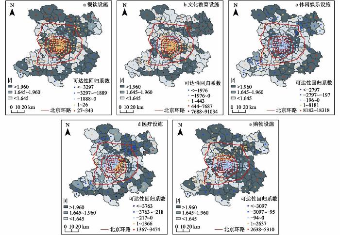 ... 设施可达性水平与生活圈半径的相关性关系呈现出设施类型上的差异性.一方面,餐饮、文化教育这两类设施可达性在回归模型中与老年人邻里生活圈半径、居住区生活圈半径均呈现出显著的正相关.这是由于餐饮、文化教育属于老年人的消遣性需求,这两类设施可达性过低的情况下餐饮、文化教育类的出行减少;而这两类设施可达性高的情况下则老年人出行量会增加;同时,老年人选择的餐饮、文化教育类设施作为活动目的地时的出行距离往往属于中长距离[30 ] ,故餐饮、文化教育类设施可达性水平低则老年人中长距离出行减少,生活圈范围相应变小,可达性水平高则反之.另一方面,休闲娱乐、医疗服务、购物这3类设施可达性在回归模型中与老年人邻里生活圈半径、居住区生活圈半径均呈现出负相关关系,这是因为这些设施对老年人来说属于刚性需求类设施,是老年人日常生活出行的主要出行目的地[25 ,31 ,32 ] ,其可达性水平提高可缩小老年人生活圈范围. ...
