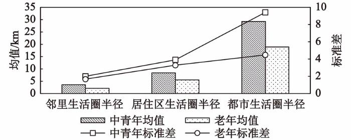 ... 生活圈研究对城市规划实践具重要指导意义,其结构圈层[1 ~6 ] 、功能圈层[7 ~11 ] 的特征研究能够直接引导设施配置的规模、类别、布局.老年人生活圈特征研究是社会地理学和交通地理学等学科领域的重要科研议题之一,对宜老化城市建设具有重要的指导意义.当前研究主要集中在两方面:① 老年人生活圈的规模特征研究,其研究对象多为社区生活圈、研究数据多为小样本调查数据,研究方法主要包括描绘TIN数据区[12 ] 、单一出行时长法[13 ] 、K -means空间聚类[14 ] 等;② 老年人生活圈的功能特征研究,多采用调查问卷等小样本数据方法,其研究结果表明老年人的出行活动存在明显的多层次圈层特征分异,在离家近、中、远距离圈层中,老人出行活动的设施选择类型依次由多变少、频率由高变低[12 ,15 ~18 ] . ...