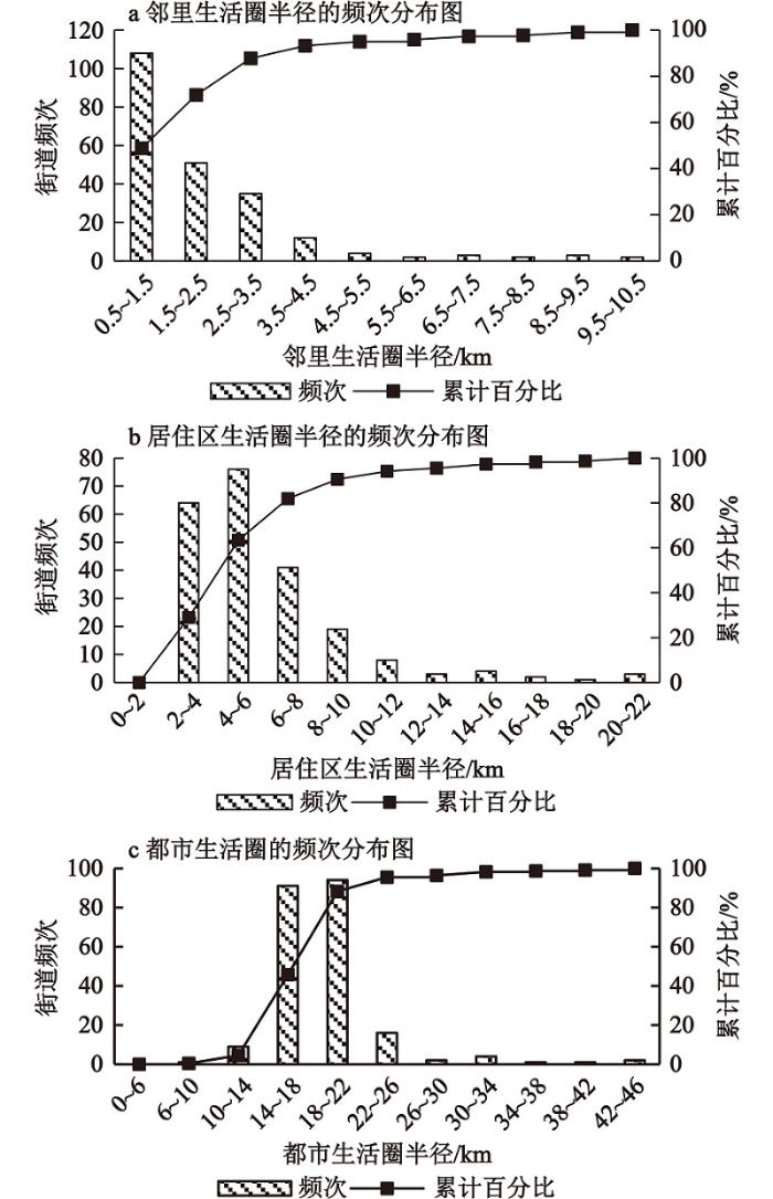 ... 一方面,生活圈及生活空间的圈层划分常以居民累计出行比率与出行距离关系中的某些斜率转折点或跳跃点为界限[12 ,26 ] .本研究基于手机信令OD数据,记录单个地理网格每隔5%出行率的圈域半径的平均值,如图3a ,存在明显的斜率转折点(20%、50%、90%累计出行率),其对应的圈域半径分别约为2 km、8 km、20 km.另一方面,生活圈的圈层划分常以居民的出行频率、交通方式为依据,以便于进行公共服务设施配置的分析[7 ,8 ] .本研究中老年人生活出行频率的统计如图3b ,0~2 km、3~8 km、8 km以上分别属于高频率出行(36%)、中频率出行(8%~16%)、低频率出行(≤6%),参照北京市综合交通调查结果,0~2 km、3~8 km、8 km以上分别对应步行和自行车为主、自行车与公交及其他代步机动车为主、公交为主的出行方式,这3个圈域的出行频率、交通方式具有显著差异.本研究以从地理网格出发20%、50%、90%累计出行率对应的圈域范围分别界定为老年人生活圈及设施配置的3个层次,为方便其空间尺度与传统认知的衔接,分别命名为邻里生活圈、居住区生活圈、都市生活圈. ...
