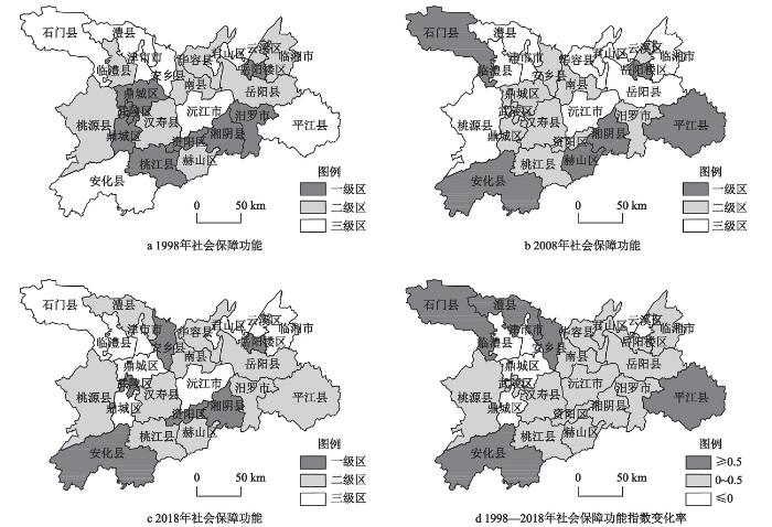 采用熵值法求出各功能得分,并在ArcGIS中采用自然断点法将耕地经济生产、社会保障、生态维护功能值从高到底划分为一级区、二级区、三级区3个级别。如图1a所示,1998年洞庭湖地区经济生产功能整体水平较低,功能指数较高的一级区主要分布在云溪区、岳阳楼区等农业基础较好的地区;与1998年相比,2008年经济生产功能空间分布相对集中(图1b),并呈北部集聚的态势,岳阳楼区、湘阴县等地区经济生产功能强度仍较为突出;2018年,功能指数较高的一级区、二级区数量有所增加,并呈现出中部高,东西两侧较低的特征(图1c)。1998—2018年,洞庭湖地区经济生产功能整体呈增强趋势(图1d),功能指数变化率呈正值区域占54.17%,主要集中于洞庭湖中部、西南部区域,功能指数变化率呈负值的区域主要集中于洞庭湖东部区域。在过去的20 a间,洞庭湖地区正处于传统农业转向现代农业发展新时期,耕地利用方式由家庭破碎化经营向规模化和产业化经营转型,耕地利用方式的转变与农业科技的进步促进了南县、沅江市等地区农业生产水平大幅度提高,粮食、油料、蔬菜的总产量与平均产量均有所增加,地区农业生产能力不断增强,耕地经济生产功能提升明显。