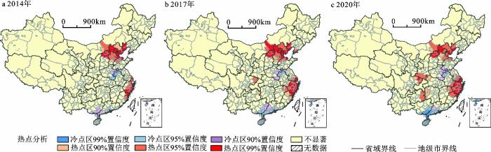 2) 从图2而以看出,2014年的热点区主要集中在京津冀及其周边地区以及东部沿海部分地区(浙江、福建、上海)。2017年、2020年热点区在京津冀及周边地区和东部沿海地区的数量变化相对平稳,而在东部沿海地区则具有向周围扩散的趋势,区别在于京津冀集聚区的置信度由99%降低到了95%,东部沿海集聚区边缘的置信度由90%增加到95%,表明美丽乡村空间分布的集聚程度更加显著。同时,2017年在西南地区四川省的达州市、巴中市和贵州省的铜仁市形成了局部热点区,2020年西南地区的热点区在2017年的基础上向四周发散,在贵州与湖南交界处和四川、陕西与湖北交界处形成两块热点区。2014—2020年冷点区主要分布在河南和安徽两省交界地区、广东和广西地区交界地区、广东和广西南部沿海地区、海南省。河南和安徽两省交界冷点区在空间的分布范围相对稳定,随着时间的推移,分布于广东和广西地区以及海南的美丽乡村冷点区范围不断扩张,并且空间分布的集聚程度愈加显著。