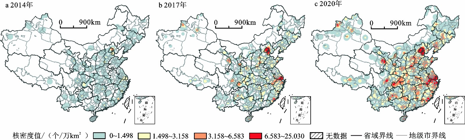 | 图1 2014—2020年中国美丽乡村核密度分析 审图号:GS(2019)1825号(自然资源部监制),底图无修改;不含港澳台数据 |