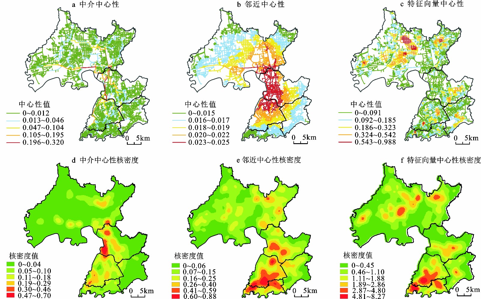 | 图2 青岛市主城区道路网络中心性与核密度估计结果 |