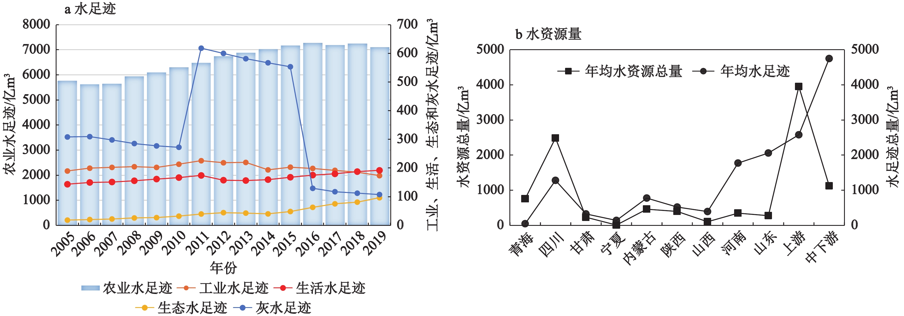 | 图1 2005—2019年黄河流域水足迹与水资源量变化 |