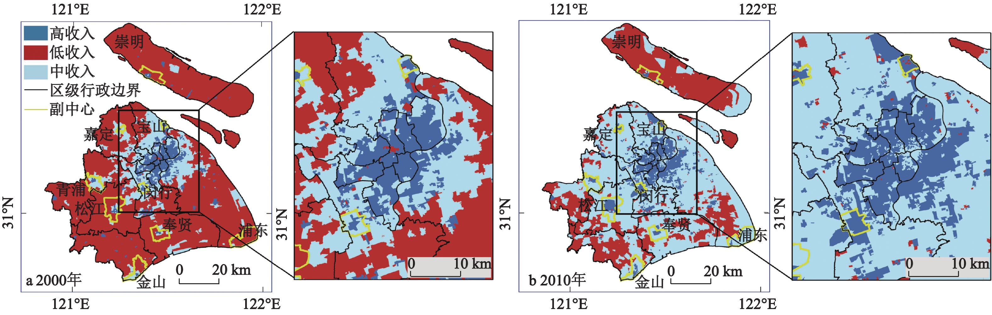 | 图1 2000年(a)和2010年(b)上海市及中心城区的社会区形态及分布格局 |