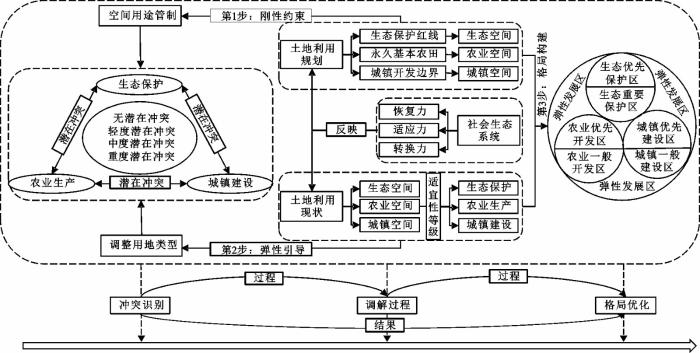 ... 一般来讲,空间冲突包括现实冲突和潜在冲突两种类型,前者主要注重冲突的直观性与现实性描述和防治,属于冲突发生后的结果分析;后者则侧重于冲突的隐藏性与潜在性探测和阻止,属于冲突发生前的源头识别与过程调解.当前,已有土地利用或国土空间冲突分析更多的聚焦于人类高强度开发所产生的土地利用问题,对现实冲突的类型识别和治理等内容开展了广泛研究.但是,面对新时期国土空间规划体系的要求,亟需探明不同区域国土空间本底条件和禀赋功能,其本质就是国土空间潜在冲突分析的过程.现有研究中关于潜在冲突内涵与驱动力[7 -8 ] 、类型识别[9 -11 ] 、强度诊断[12 ] 、空间表达[13 -14 ] 、和解策略[15 ] 以及成果应用[16 ] 等内容日趋丰富,基于“概念界定−冲突识别−冲突和解−成果应用”的潜在冲突研究范式逐渐形成.其中,在概念界定方面,从资源环境多宜性入手,揭示潜在冲突来源与形成过程,是开展潜在冲突研究的基本前提,并得到学术界的一致认同[17 ] ,但是潜在冲突作为社会生态系统的产物,已有研究缺乏将潜在冲突置于社会生态复合系统框架下解析其概念内涵;在冲突识别方面,现有潜在冲突多围绕土地利用类型开展[18 ] ,注重土地利用潜在冲突的系统认识及其向现实冲突转变的可能性分析,而基于多功能适宜性评价架构下的国土空间多功能潜在冲突研究鲜有报道[19 ] ;在冲突调解方面,多参照潜在冲突结果制定差异化调控策略,侧重多主体参与[20 ] ,未能够针对潜在冲突的不同类型与强度提供一套具有普适性的调解方案,潜在冲突调解作为国土空间用途管制的重要组成部分,刚性与弹性互动已应用于国土空间用途管制[21 ] ,然而在潜在冲突调解方面鲜有涉及;在成果应用方面,“三线”划定成为潜在冲突调解的主要应用领域[15 ] ,主要原因在于冲突和解消除了规划过程中的不确定性与潜在冲突威胁,为国土空间规划体系建设提供科学依据,然而国土空间保护开发格局作为国土空间规划体系的重要组成部分[22 ] ,承担着规范和指导人类开发强度的任务,如何科学识别潜在冲突并进行有效调解,成为国土空间保护与开发格局构建的重要基础. ...