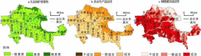 ... 结合已有文献[29 ] ,从侧重资源环境本底的土地、水、环境、生态、气象、灾害等方面选取指标进行国土空间多功能适宜性评价.其中,生态保护功能评价(表1 )包括生态系统服务功能与生态敏感性2个方面,e 1 ~e 4 表征生态系统要素、结构运转过程中的正外部性效应,体现生态系统服务功能;e 5 ~e 6 表征一定区域发生生态问题的可能性和程度,体现生态敏感性.农业生产功能评价(表2 )包括土地资源、水资源、气候、环境、灾害、生态条件6个方面,其中a 1 ~a 2 表征农业生产的土地资源可利用程度;a 3 ~a 4 表征区域水资源对农业生产的保障能力;a 5 表征光照、热量等自然气候条件对农业生产的支撑水平;a 6 表征环境系统对农业发展的支撑能力;a 7 表征农业生产受到与气象因子有关灾害的影响程度和强度;a 8 表征蒸发量/降水量、地下水埋藏深度与矿化度、土壤质地等生态因素对农业耕作条件的影响程度.城镇建设功能评价(表3 )包括土地资源、水资源、气候、环境和灾害状况5个方面,其中c 1 ~c 2 表征城镇建设的土地资源可利用程度;c 3 表征区域水资源对城镇建设的保障能力;c 4 表征气候条件对人居生活提供的温度与湿度组合特征;c 5 ~c 7 表征环境系统对城镇建设的支撑能力;c 8 ~c 10 表征城镇建设及人类生存居住受到地震、地质灾害等影响的大小和可能性. ...