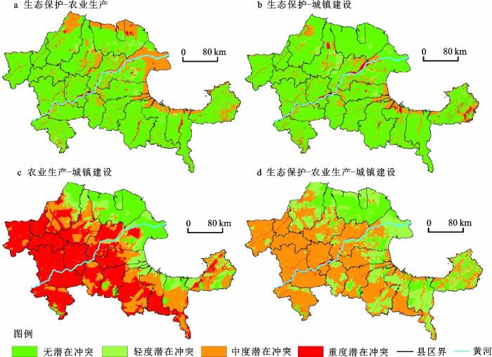 ... 黄河流域生态保护和高质量发展为黄河流域产业集聚[1 ] 、居民生活质量提升[2 ] 、空气治理[3 ] 与碳排放[4 ] 等社会经济可持续发展与资源环境可持续利用提供了战略指引.资源环境作为支撑人类福祉提升的重要依托[5 ] ,由资源要素多宜性引发的潜在冲突日益突出,科学识别并有效调解潜在冲突对强化国土空间用途管制、缓解用地矛盾、重塑国土空间保护开发格局具有重要意义[6 ] . ...