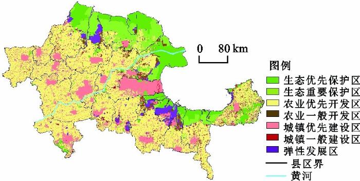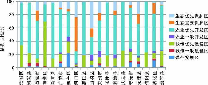 ... 第三步:以等级划分生态保护与开发建设格局.将上述两步得出的分区结果借助国土空间多功能适宜性评价结果划分为生态优先保护区、生态重要保护区、农业优先开发区、农业一般开发区、城镇优先建设区与城镇一般建设区,其中“三线”均设为相应的优先区.另外考虑未来土地利用的不确定性[30 ] ,在识别与适宜性等级错配或不完全适宜地类基础上在无潜在冲突区设置国土空间弹性发展区,其中生态保护弹性区包含农业生产与城镇建设一般适宜及以下的农业用地和建设用地,农业开发弹性区包括城镇建设不适宜且农业生产适宜的非现状农业用地,城镇建设弹性区包括农业生产不适宜且城镇建设适宜的非现状建设用地;同时,将中度潜在冲突区符合生态保护一般重要且农业生产与城镇建设适宜条件的生态用地调整为综合弹性发展区. ...